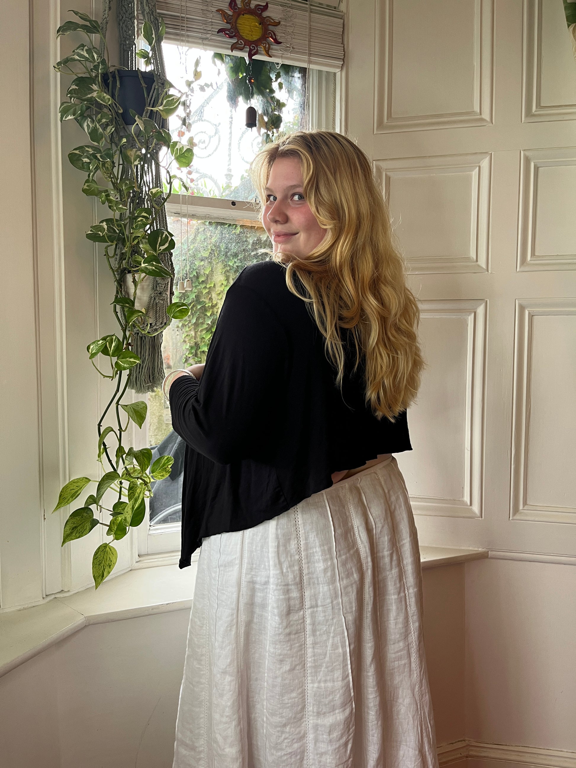 An effortlessly cool vintage black top with a versatile design you can wear open or tied at the front. Lightweight and easy to style, this piece brings a relaxed yet chic edge to your wardrobe.